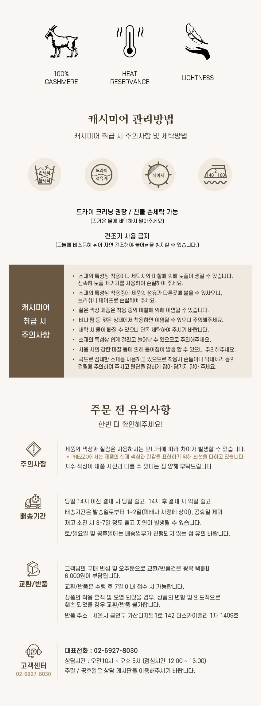 100% 캐시미어 소재로 가볍고 포근한 촉감과 뛰어난 보온성을 자랑하며, 가을 겨울 일상에서 부담 없이 즐기실 수 있습니다.