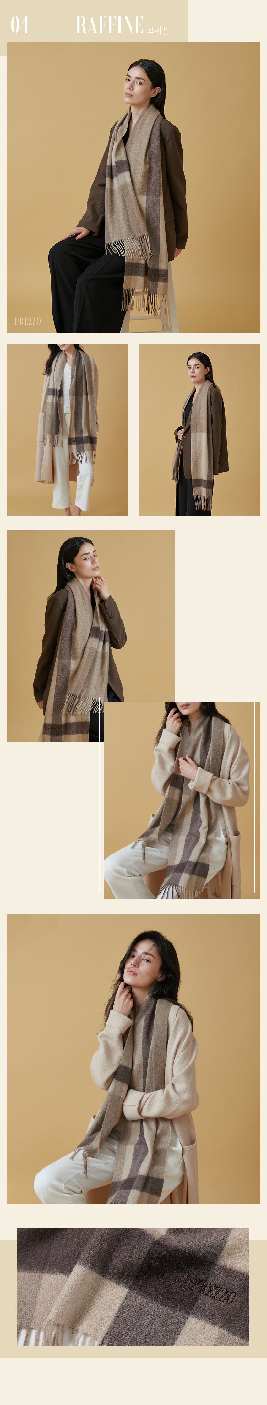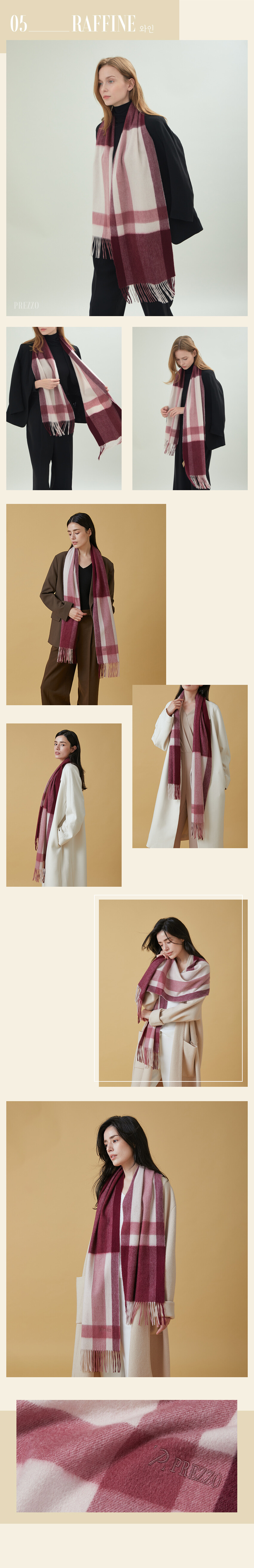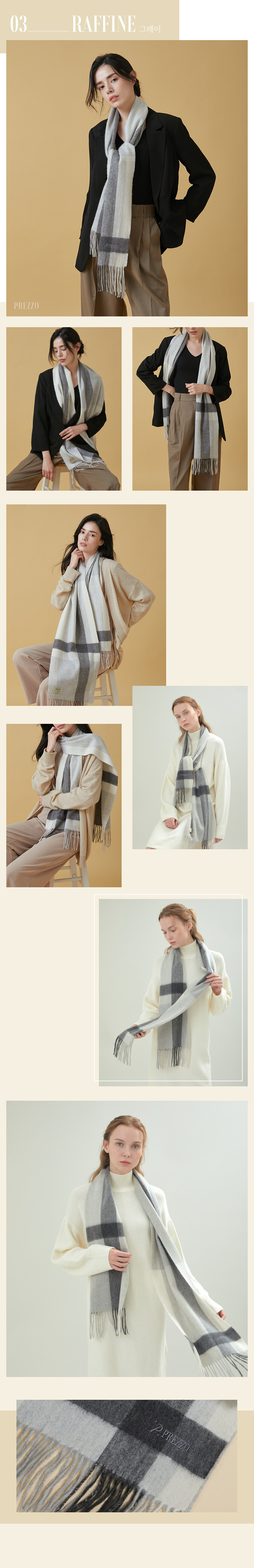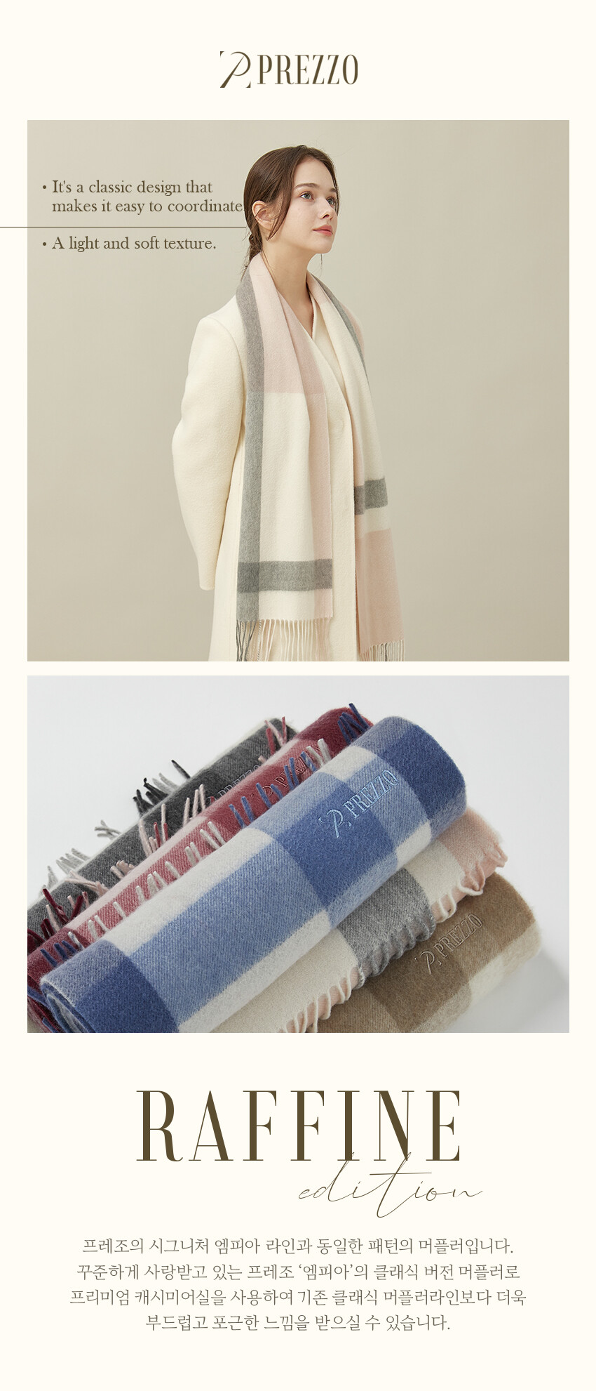 PREZZO Premium Cashmere Muffler Collection의 RAFFINE Edition입니다. 프레조의 가장 사랑받는 라인인 엠피아 디자인을 클래식 머플러로 제작하였습니다. 가장 사랑받는 디자인을 데일리로 사용하기 편한 클래식 머플러로 캐시미어 중 제일 좋은 프리미엄 실을 사용하여 포근한 느낌을 살렸습니다.