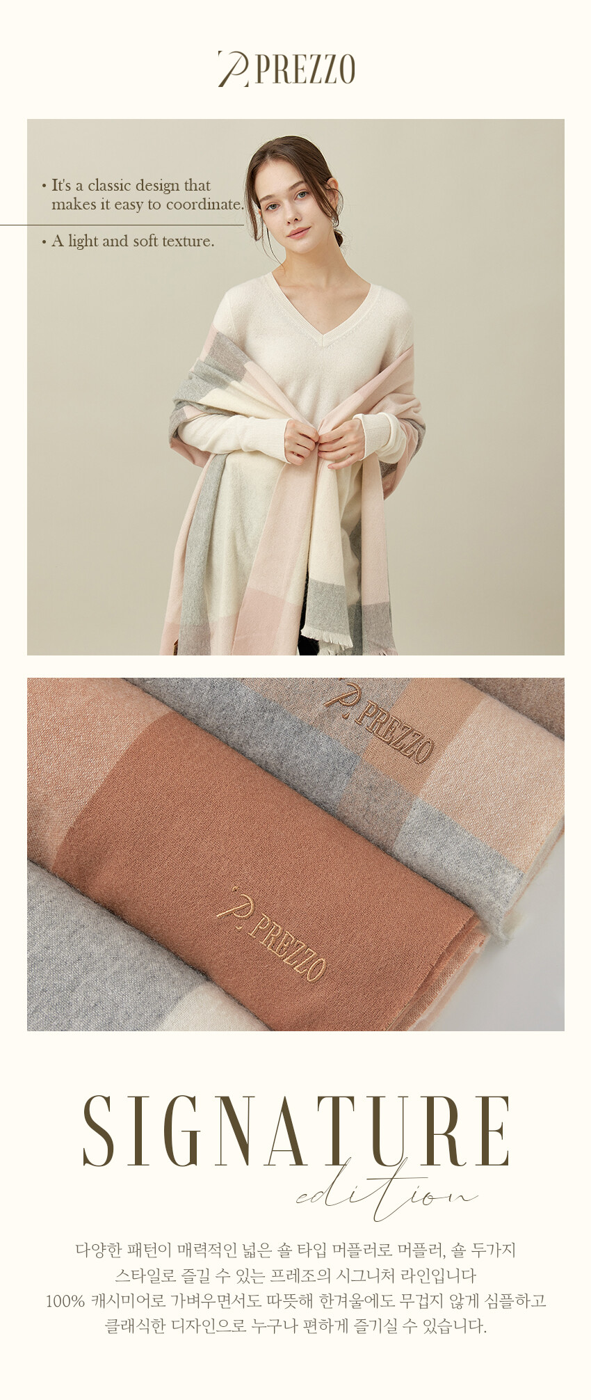 PREZZO에서 가장 추천하는 시그니쳐 컬렉션으로 캐시미어 중에서도 가장 부드러운 원사를 직조 방식으로 가공한 머플러입니다.풍성한 크기로 다양한 의상에 고급스러운 코디가 가능합니다.아는 사람만 알 수 있는 최고의 제품을 언제나 당신의 일상과 함께 하세요.40% 세일 가격에 2개 이상 커플 세트 구매 시 20,000원 추가 할인 가격입니다.